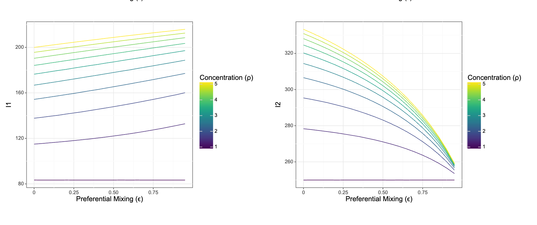 \[ \begin{aligned} \lambda_1 &= \beta \rho S_1 \left(\epsilon \frac{ I_1}{N_1} + (1-\epsilon)\frac{I_1 + I_2}{N}\right) \\ \lambda_2 &= \beta S_2 \left(\epsilon \frac{I_2}{N_2} + (1-\epsilon)\frac{I_1 + I_2}{N}\right) \\ \end{aligned} \qquad(1)\]